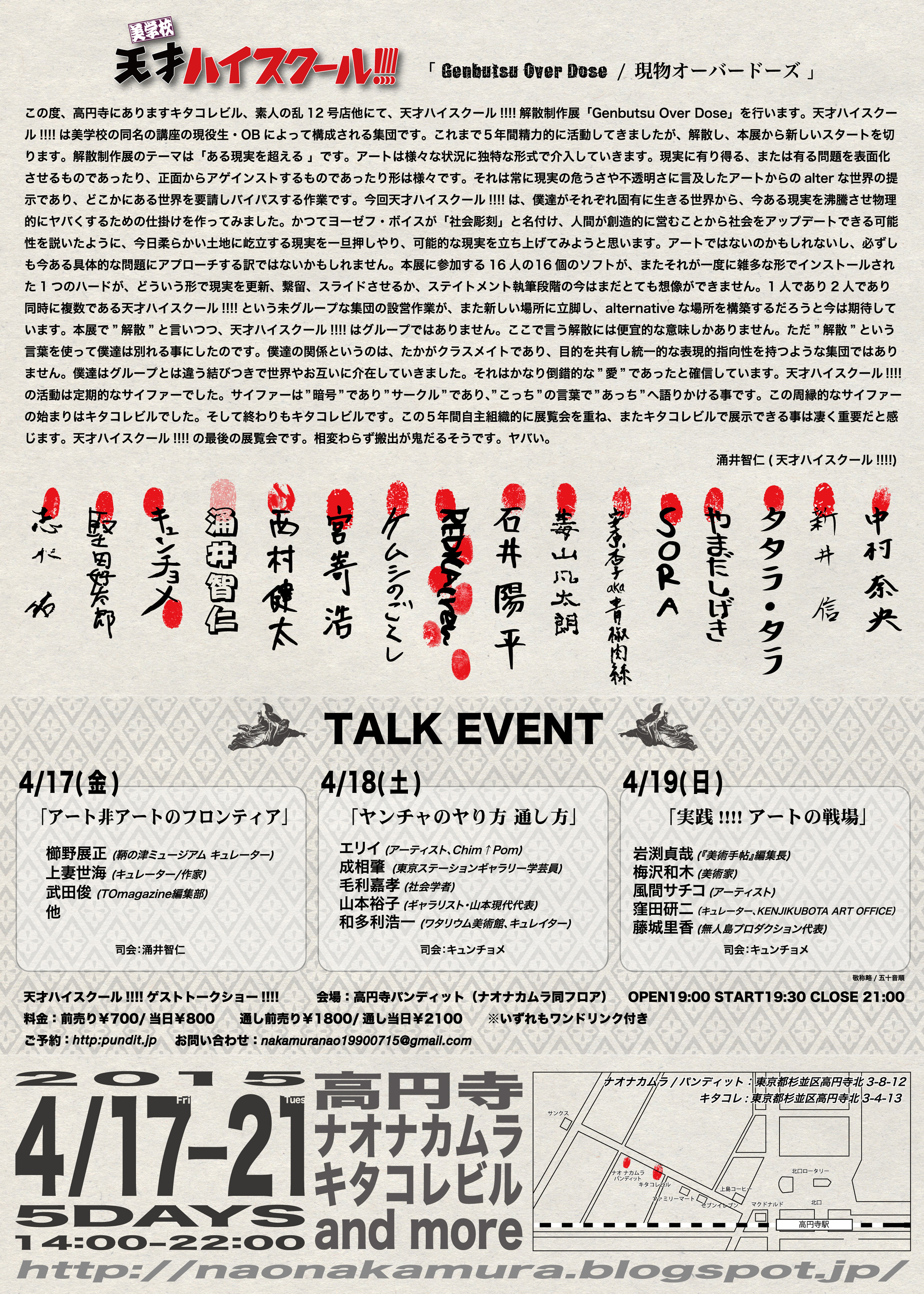 この度、高円寺にありますキタコレビル、ナオナカムラ(素人の乱12号店)他にて、 天才ハイスクール!!!!解散制作展「Genbutsu Over Dose」を行います。