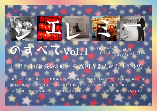 ジェレミーのすべて Vol.1 投稿日: 2012年11月22日by 12gouten Original 歌 Original 映像 Original 対談12月2日(日)昼の3時から 高円寺素人の乱12号店★ワンコイン 500円 ★昔の英語の歌 ★今年出来た日本語の歌、何曲か ★ハーポ部長:映画と人生の対談(日本に興味を持ったきっかけ初発表) ★他 ★ジェレミーのすべては一期一会なので、できれば動画と録音をとって欲しくない。別に怒らないけど。