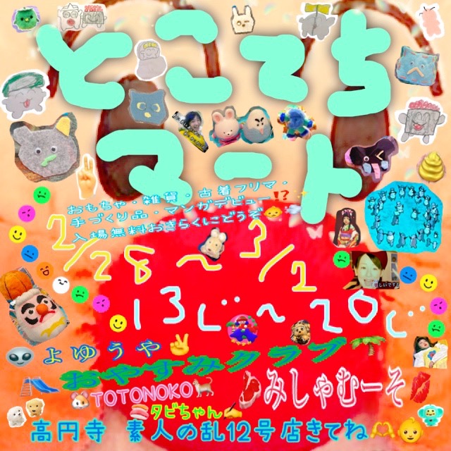 🐾 とこてちマート 🍵 投稿日: 2025年2月19日2025年3月8日by 12gouten 2/28(金)〜3/2(日)🎎 13:00〜20:00 高円寺 素人の乱12号店(雑貨!未完成の前の2階つきあたり) 入場無料🏝️👽ょゅぅゃ✌️ 🥩みしゃむーそ💋 🛝おやすみクラブ🌴 🍣タビちゃん✍️ 🐹TOTONOKO🐈おもちゃ・雑貨・古着フリマ・手づくり品・マンガデビュー⁉️ぬいぐるみをつくるかい❓❔いつでもどうぞおきらくに〰おいでましッソョ👶🚼💨