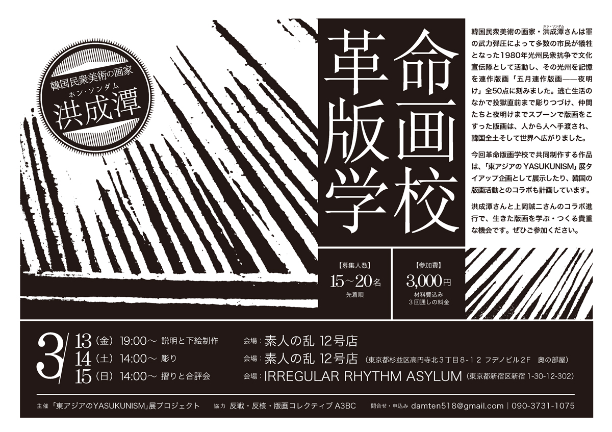 1980年5月18日に突如として出現した、T.A.Z(一時的自律ゾーン)―民衆自治による光州(クァンジュ)コミューン。その開放と弾圧の記憶を木版画に刻み込んだ画家・洪成潭(ホン・ソンダム)さんの、日本での民衆美術運動「革命版画学校」の連続制作講座を高円寺 素人の乱12号店と新宿 IRREGULAR RHYTHM ASYLUM で行います。