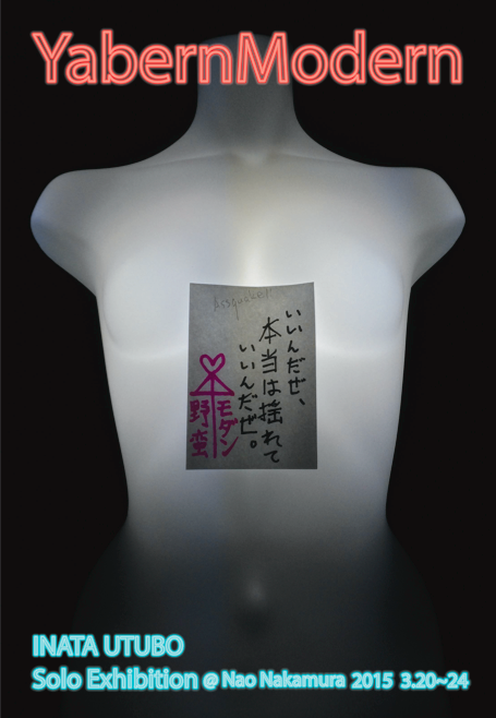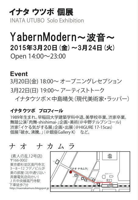 イナタウツボ個展「YabernModern -波音-」 投稿日: 2015年3月16日by 12gouten 会期: 2015年3月20日(金)~3月24日(火) 14:00~23:00 オープニングレセプション: 20日(金)18:00~ イベント: 22日(日)19:00~イナタウツボ×中島晴矢(現代美術家・ラッパー)によるアーティストトーク 会場: 素人の乱12号店(東京都杉並区高円寺北3-8-12 フデノビル2F) 詳細: ナオ ナカムラ